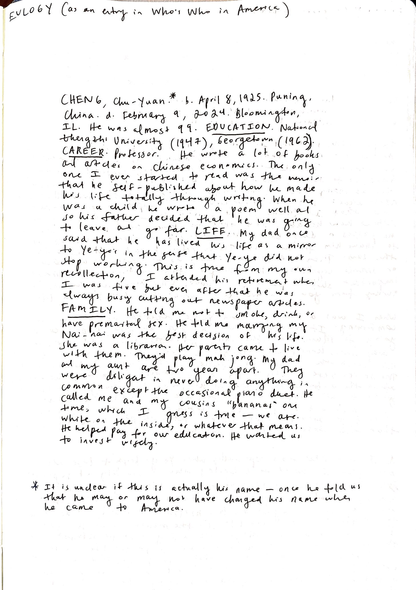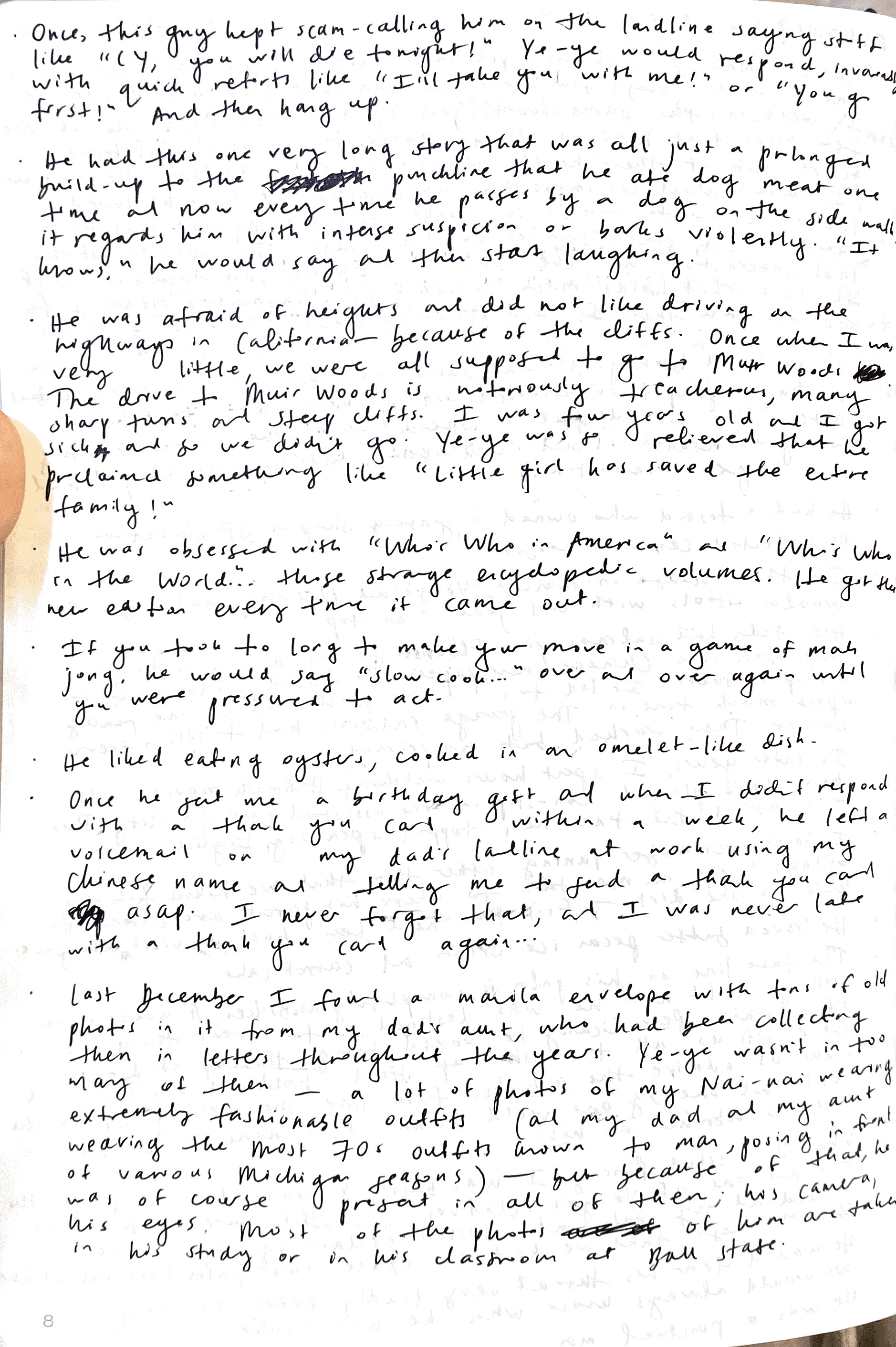 In truth, it is still challenging at times to confront the extent to which I don’t know or understand Ye-ye. I only saw him once or twice a year. For many years, I didn’t know enough Chinese to pick up on the greater nuances of what he was saying. I forgot many of his stories because I was not paying attention. I didn’t know where in China he went to college until I read his obituary. I learned a lot from reading his obituary that I should have known before. Writing the eulogy-as-elegy was helpful for me in this way, a way of grappling with my familiarity and estrangement; in its “pastoral” premise (not countryside in a literal sense, but any “lost” place), it also helped me reflect on how many of my memories of him are also memories of places.