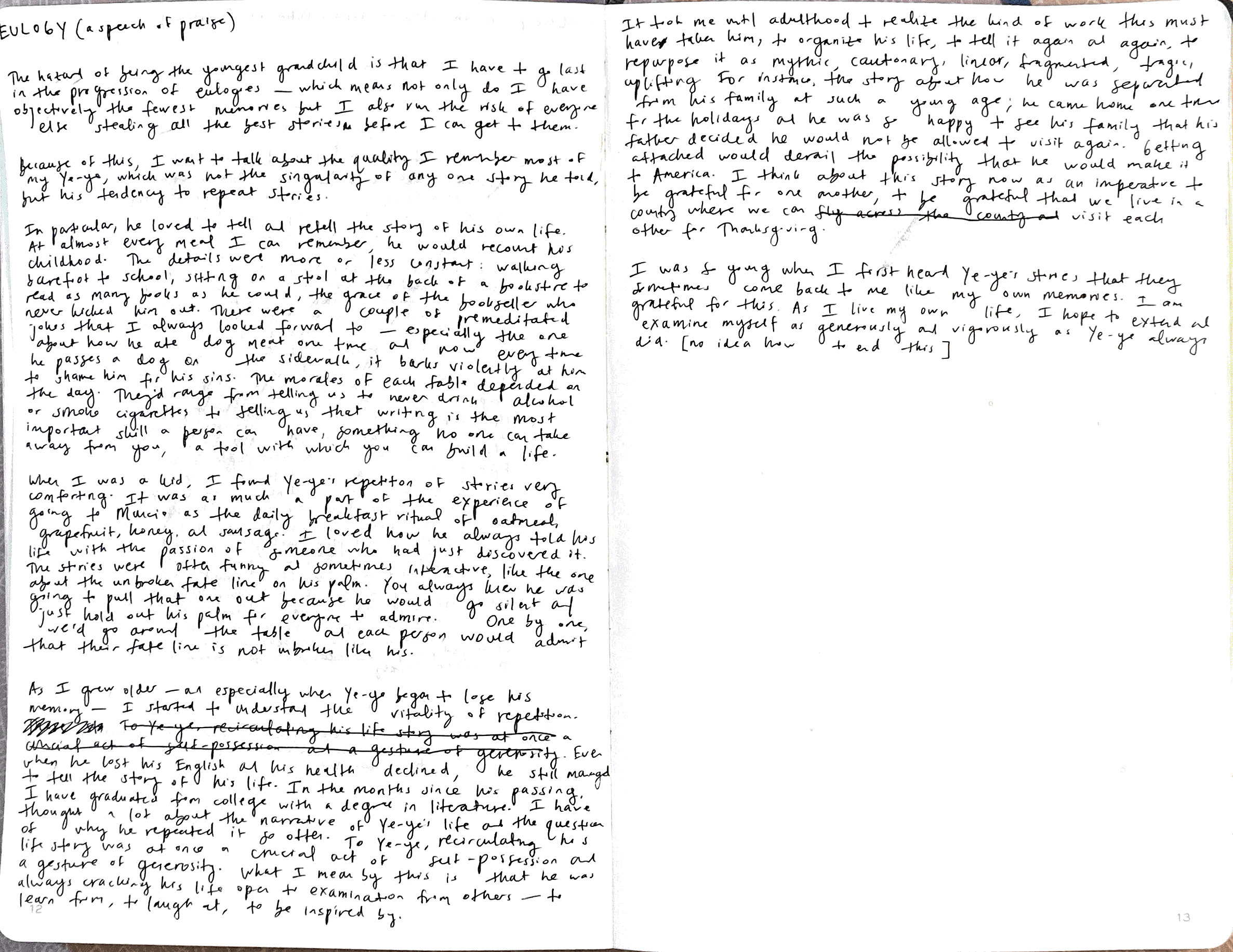 Eulogies also work as a composite. The meaning of each individual speech is inevitably put in conversation with every other speech given that day, to ask the implicit question of How was this person consistent? How did they diverge? For Aunt Jean, nearly everyone talked about her cooking, her generosity, her peanut-butter rice krispie treats, her sticky rice, the grocery store that she treated as a centerpiece of community. As each person came up to speak, it felt like they were collectively recreating the living pulse of her. But this is another unpredictable aspect of eulogy-writing. Before the day of the funeral itself, you have no real way of knowing how your singular perspective will slot into the total portrait. It does make you wonder at the randomness of how a person’s life can be narrativized at its culmination, when it is no longer up to the person themself.