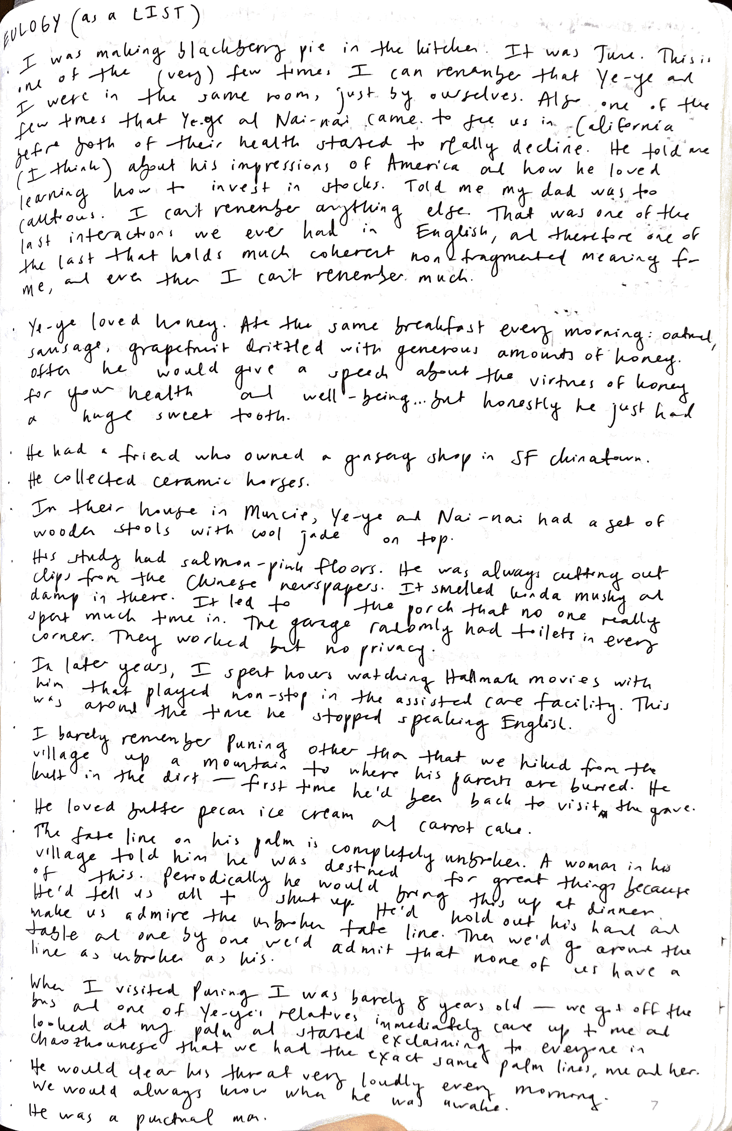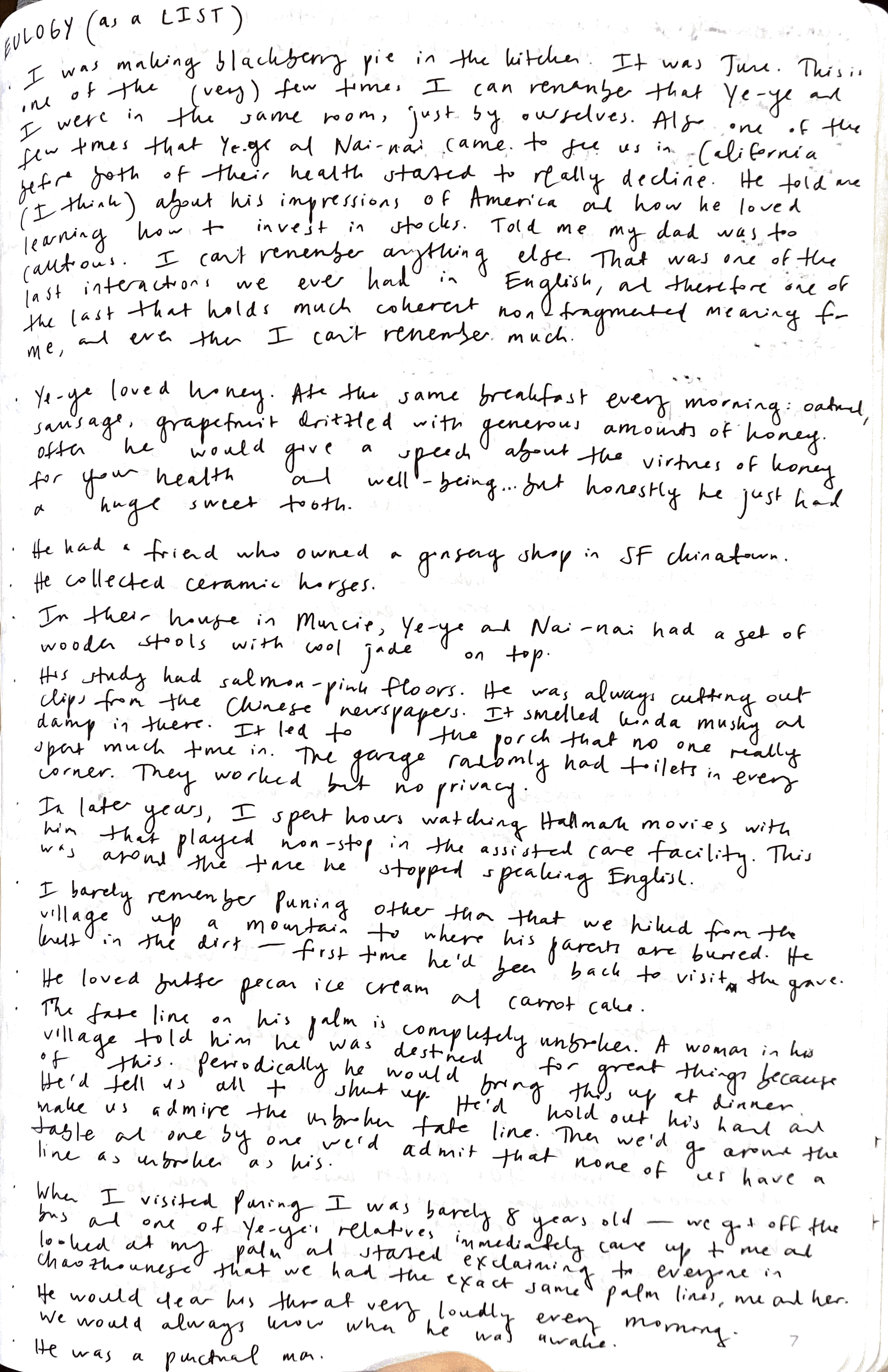 I find a lot of comfort in lists when I can’t figure out what I’m saying. By removing the imperative of coherence, I can examine the gaps in my head more honestly. This is helpful for grief and forgetfulness in particular, a gap-ridden space.1 Here, I gave myself the simple prompt of filling two pages with things I remember of Ye-ye, with no regard for chronology or relative levels of importance.