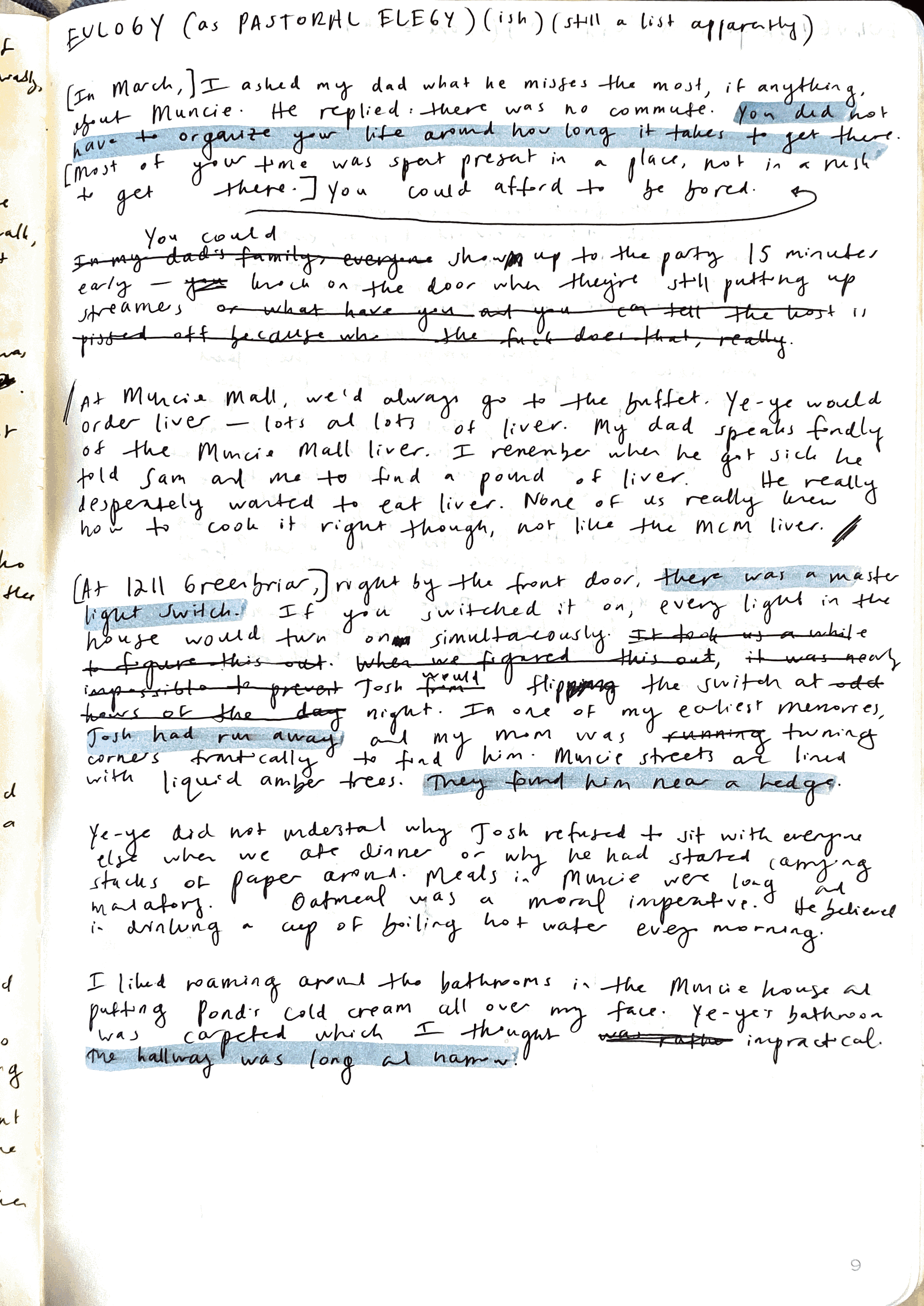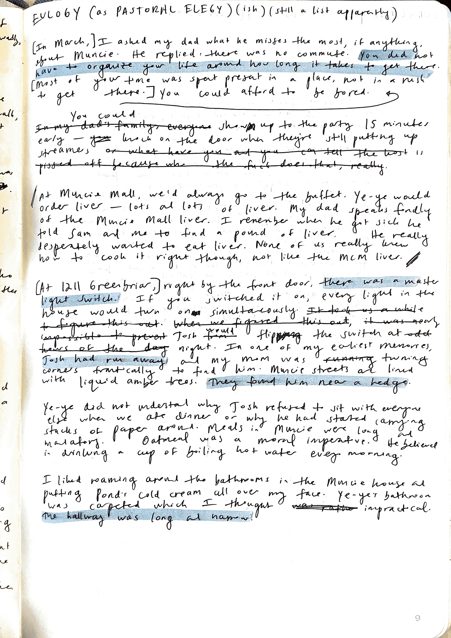 I am unaccustomed to starting with form and working toward what I really mean to say; almost invariably, I prefer to go the other way around (as much as that binary is a myth). But because I was having so much trouble even remembering Ye-ye, and because the eulogy itself is such a specific (but expansive) form, I experimented with different forms of writing to both ground myself in the act of recollection and extend beyond what I can easily regurgitate. I’ve decided to share some of them here.